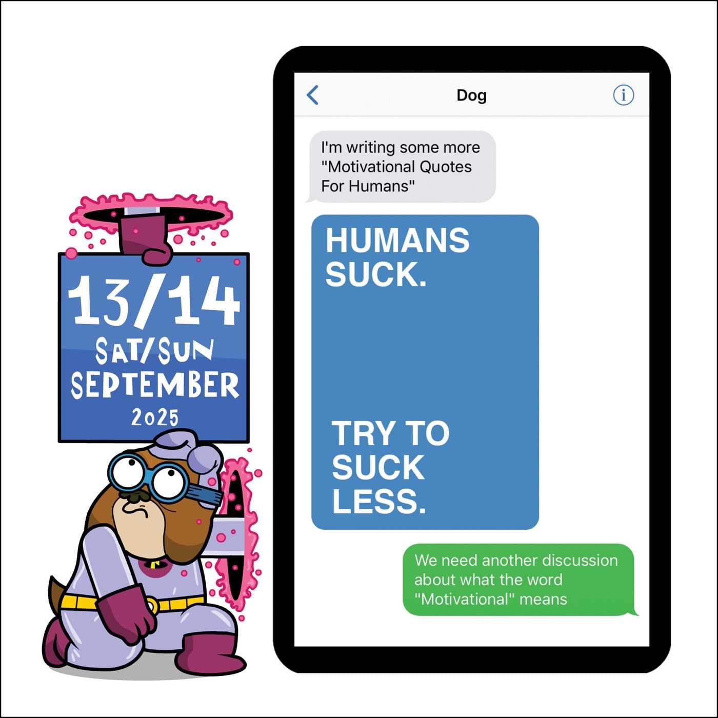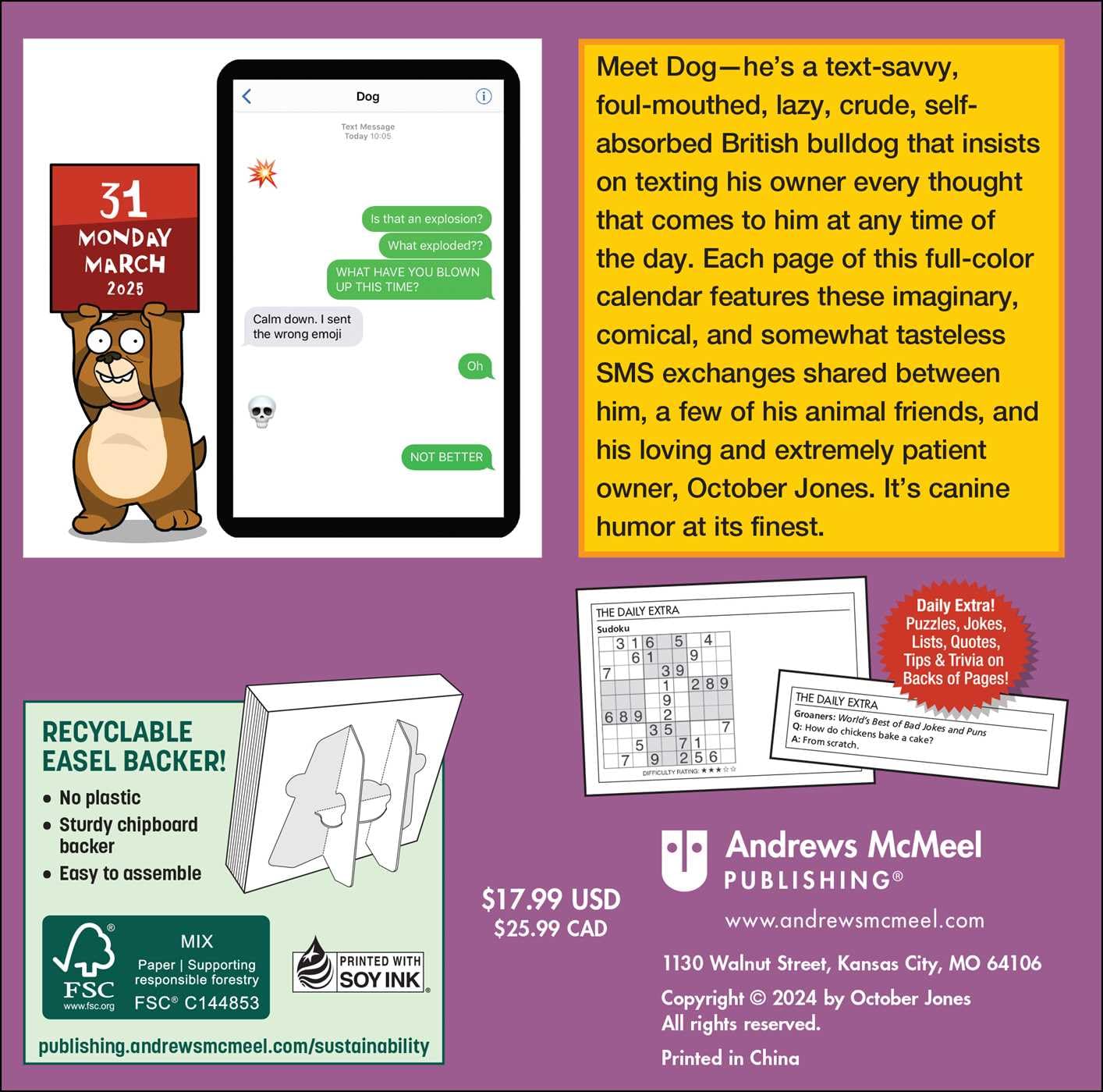 Meet Dog―he's a text-savvy, foul-mouthed, lazy, crude, self-absorbed British bulldog that is insistent on texting his owner every thought that comes to him at any time. Each day of the Texts from Dog 2025 Day-to-Day Calendar features these imaginary, comical, and somewhat tasteless SMS exchanges shared between him and his loving and very patient owner. It's canine humor at its finest.