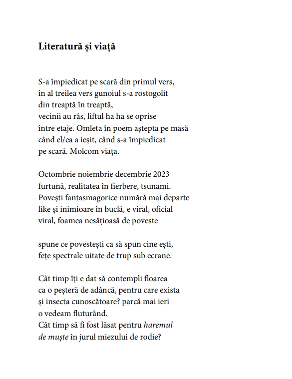 Despărțirea de 70-ism, pe care 80-iștii ar fi vrut-o radicală și un shift major de paradigmă, n-a fost totuși, privind retrospectiv, un hiatus dintre acelea care despart două lumi sau două epoci. O dovedește poezia Ioanei Ieronim, a woman of two worlds care nu plictisește și nu dă impresia că ar rula aceleași teme și scenarii cu toate că a arătat în ultimul deceniu o uimitoare productivitate. Noua colecție de poeme a Ioanei, Antidot, îmi pare cartea sa cea mai angajată în tumultul lumii noastre în vrie – exasperarea este acum motorul acestei poezii care caută în realitatea tot mai sufocantă și mai belicoasă o cale de mijloc, un modus vivendi ce ocolește radicalismele tumefiante, violența și graba care lasă puzderie de cicatrice pe chipul omului contemporan.
