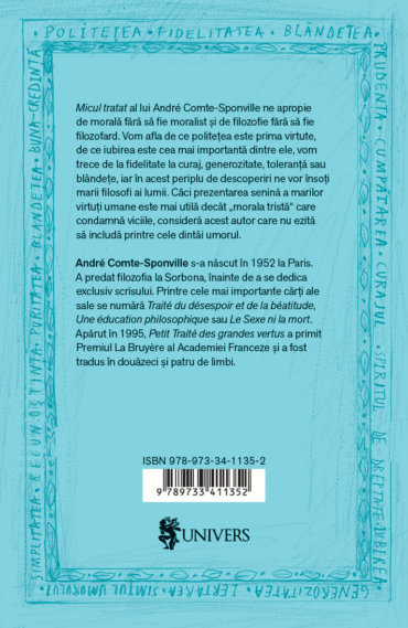 Micul tratat al lui André Comte-Sponville ne apropie de morală fără să fie moralist și de filozofie fără să fie filozofard. Vom afla de ce politețea este prima virtute, de ce iubirea este cea mai importantă dintre ele, vom trece de la fidelitate la curaj, generozitate, toleranță sau blândețe, iar în acest periplu de descoperiri ne vor însoți marii filosofi ai lumii. Căci prezentarea senină a marilor virtuți umane este mai utilă decât „morala tristă“ care condamnă viciile, consideră acest autor care nu ezită să includă printre cele dintâi umorul.