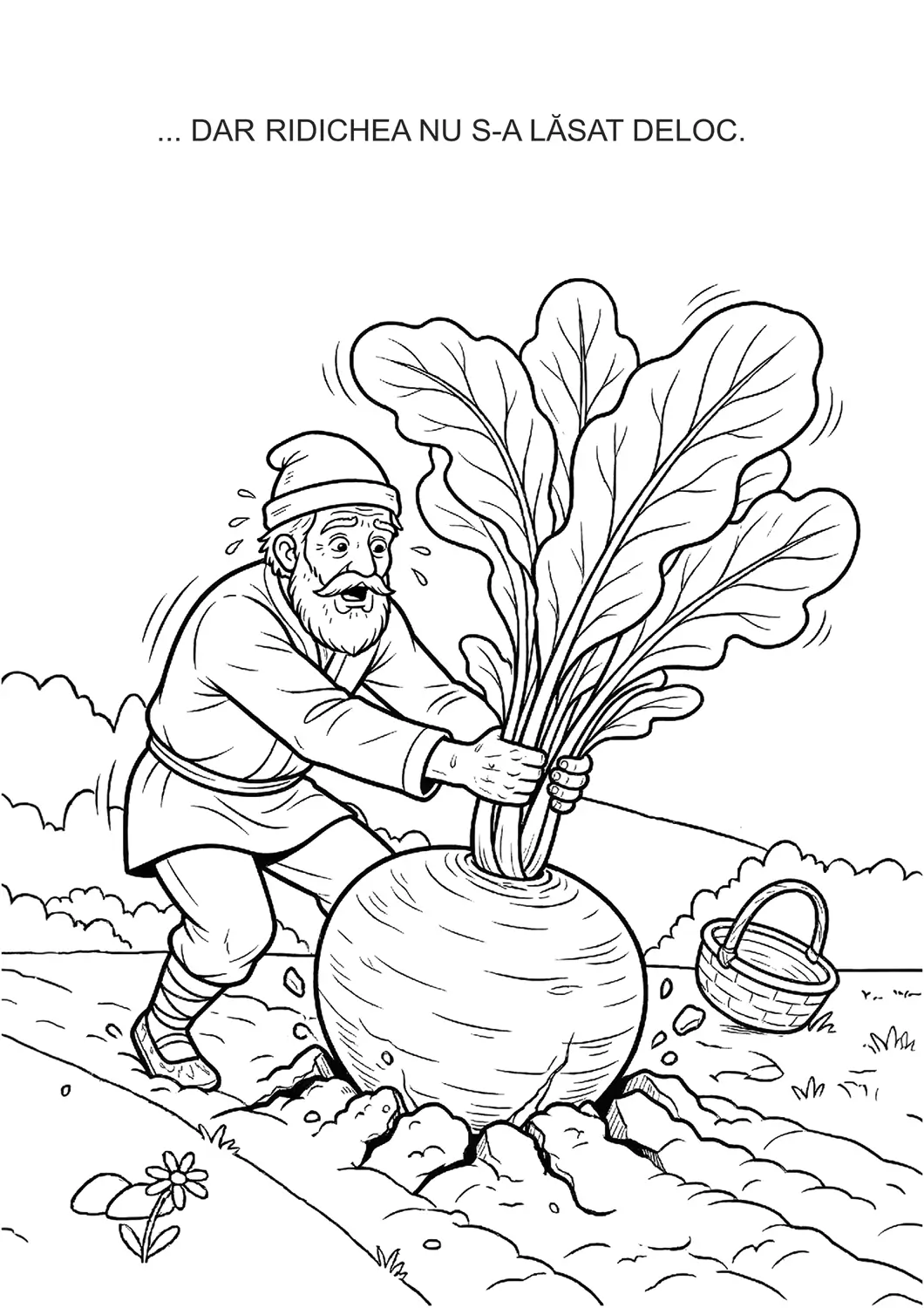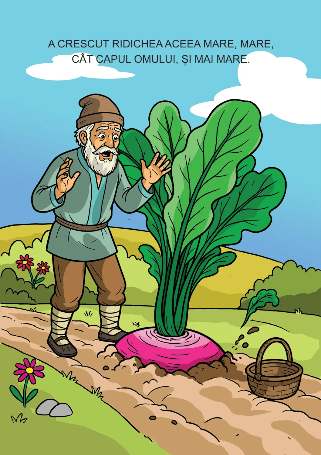 Fiecare pagina ilustreaza scene memorabile din poveste: ridichea uriasa care nu vrea sa iasa din pamant, bunicul care trage cu toata puterea, bunica care il ajuta, nepoata care se alatura eforturilor, si chiar si animalele care se implica in cele din urma pentru a rezolva dilema. Morala clasica este: "Unde-i unul nu-i putere, unde-s multi puterea creste" .