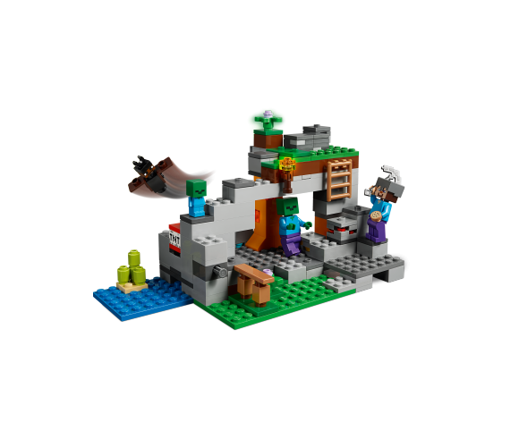 Pune-ti casca, ia tarnacopul de fier si aventureaza-te in Pestera cu zombi si plina de lilieci, completata cu scara si cuptor. Activeaza functia de dinamita pentru a patrunde prin explozie. Lupta-te pentru a-i invinge pe zombi si pe bebelusul zombi cel iute de picior. Extrage zacaminte de carbune, piatra rosie, aur si diamant, dar atentie la blocurile de pietris in cadere! Dupa ce termini, fa-ti plinul cu o prajiturica gustoasa Minecraft. Pregateste-te de actiune serioasa LEGO Minecraft!