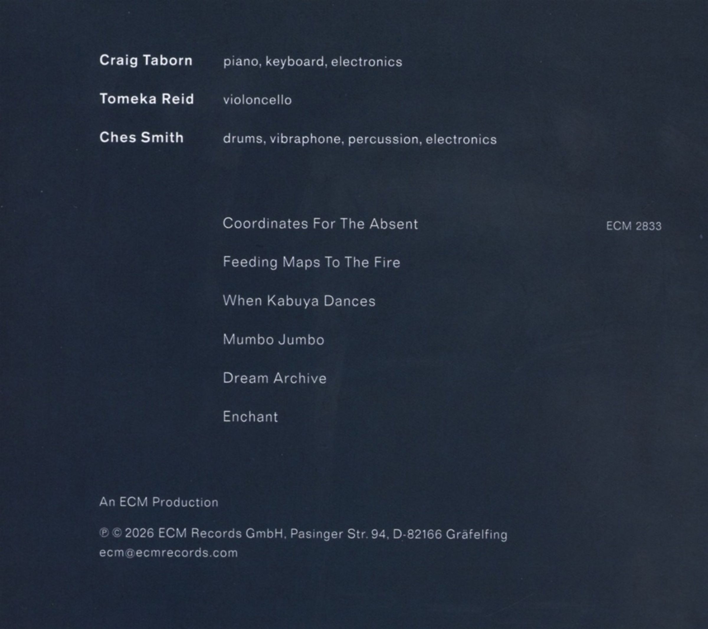 Coordinates For The Absent - 5:51Feeding Maps To The Fire - 7:22When Kabuya Dances - 7:27Mumbo Jumbo - 5:19Dream Archive - 12:04Enchant - 11:46