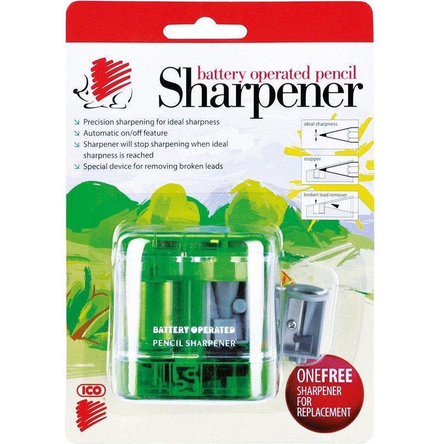 Ascuțitoare electrica, alimentată cu 2 baterii tip AA, pentru ascuțirea creioanelor cu grafit și colorat.
