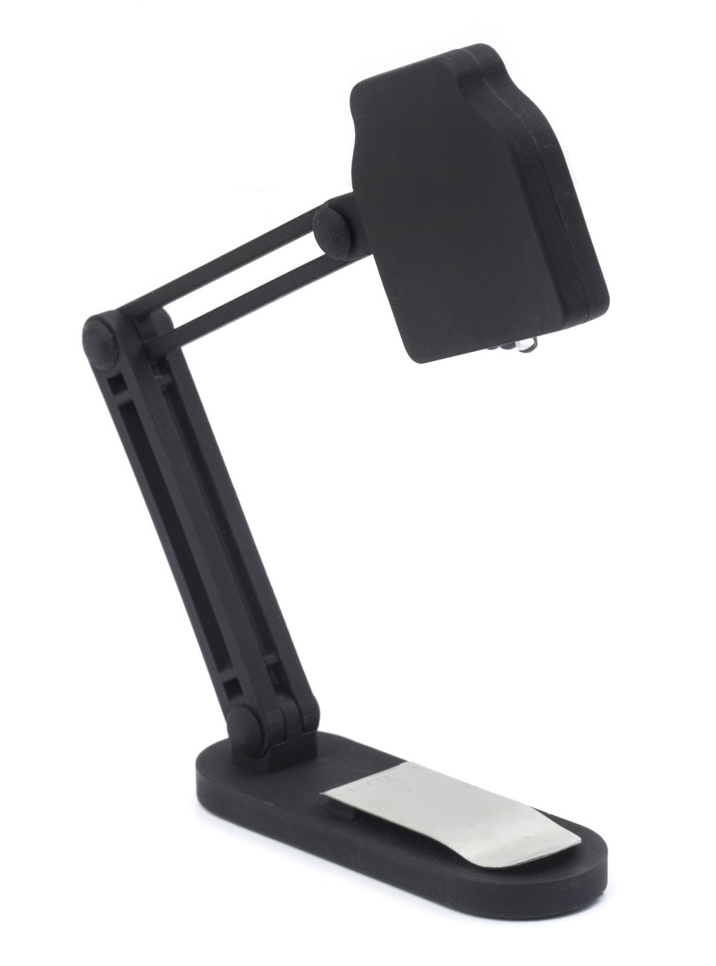 Lampa pentru citit portabila, de culoare neagra, se prinde cu usurinta de orice carte.