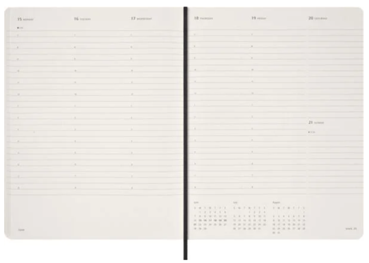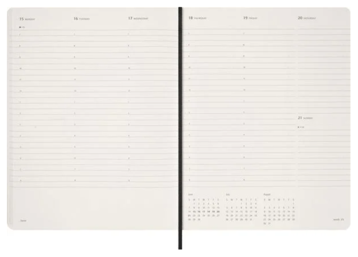This slim and elegant planner, featuring the unmistakable Moleskine design, has a flexible yet durable cover. Inside, each week is displayed across two pages. The days of the week are displayed vertically, with hourly boxes for your appointments from 7 a.m. to 8 p.m., except for Saturday and Sunday, which are untimed. Each week also includes a small 3-month calendar to give your planning some perspective.