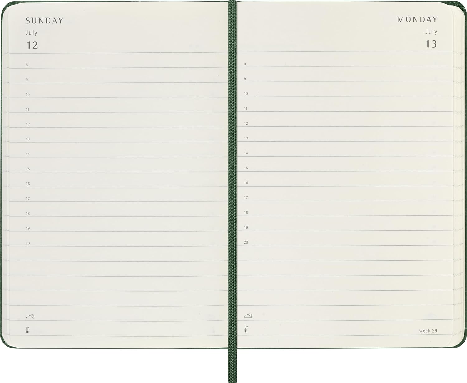 • ICONIC DESIGN: The planner features rounded corners, an elastic closure, a ribbon bookmark, and the "in case of loss" notice on the front page. Ivory-colored acid-free paper, 70 g/m²
