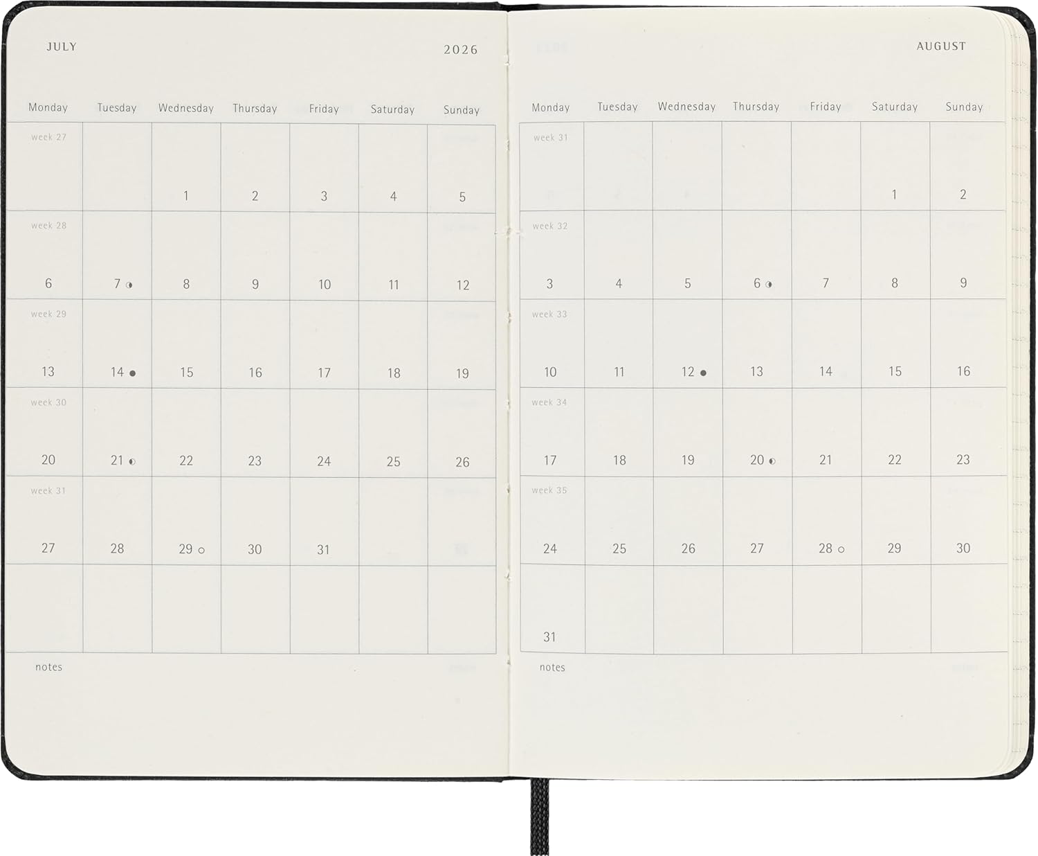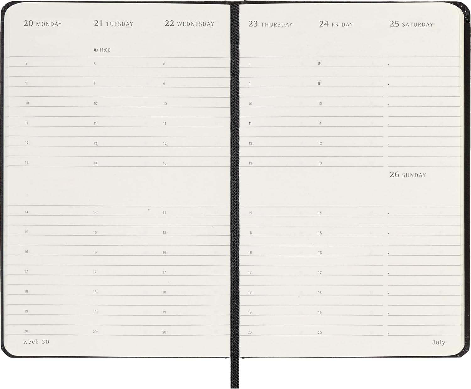 • VERTICAL LAYOUT: the planner presents each week on two facing pages with the days running from one margin to the other at the top.