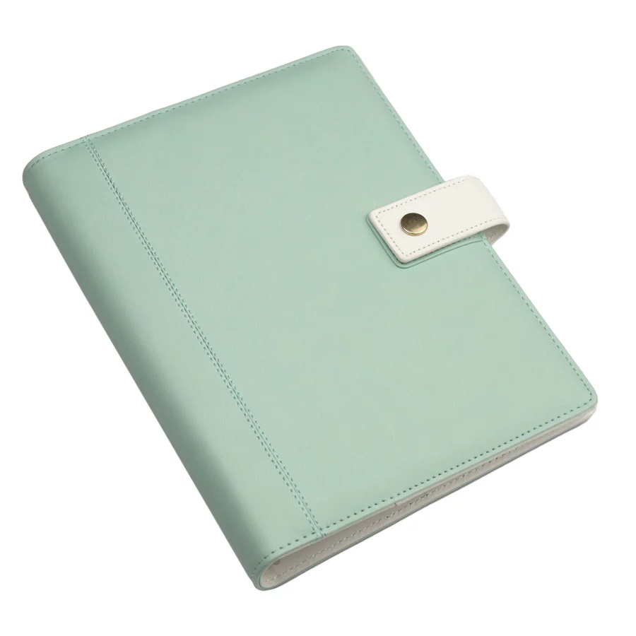 Cu o copertă din piele ecologică fină la atingere, închidere prin capsă și inele argintii rezistente, este o combinație perfectă între design frumos și practic. Conține 4 buzunare mici în interior, un buzunar mare și un suport pentru instrumente de scris, astfel încât să puteți păstra hârtii, bilete, carduri, autocolante, pixuri și multe altele.