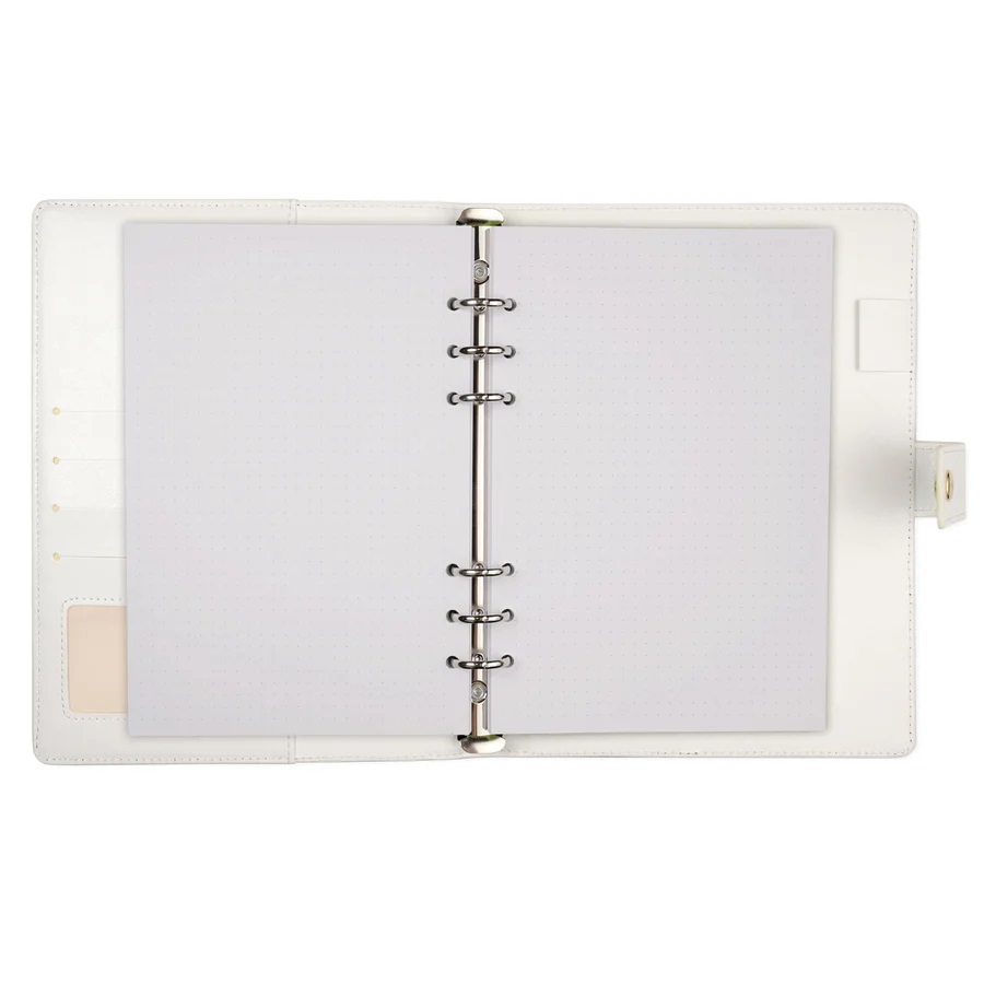 Cu o copertă din piele ecologică fină la atingere, închidere prin capsă și inele argintii rezistente, este o combinație perfectă între design frumos și practic. Conține 4 buzunare mici în interior, un buzunar mare și un suport pentru instrumente de scris, astfel încât să puteți păstra hârtii, bilete, carduri, autocolante, pixuri și multe altele.