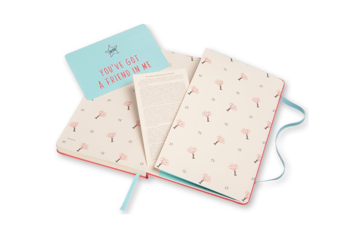 The Moleskine Toy Story Limited Edition Notebook. This large, ruled notebook has a hard cover with Toy Story-themed graphics, as well as themed endpapers and a themed postcard. The 240 ruled pages are made from acid-free, ivory coloured paper. The notebook includes an expandable inner pocket for loose notes and cards.