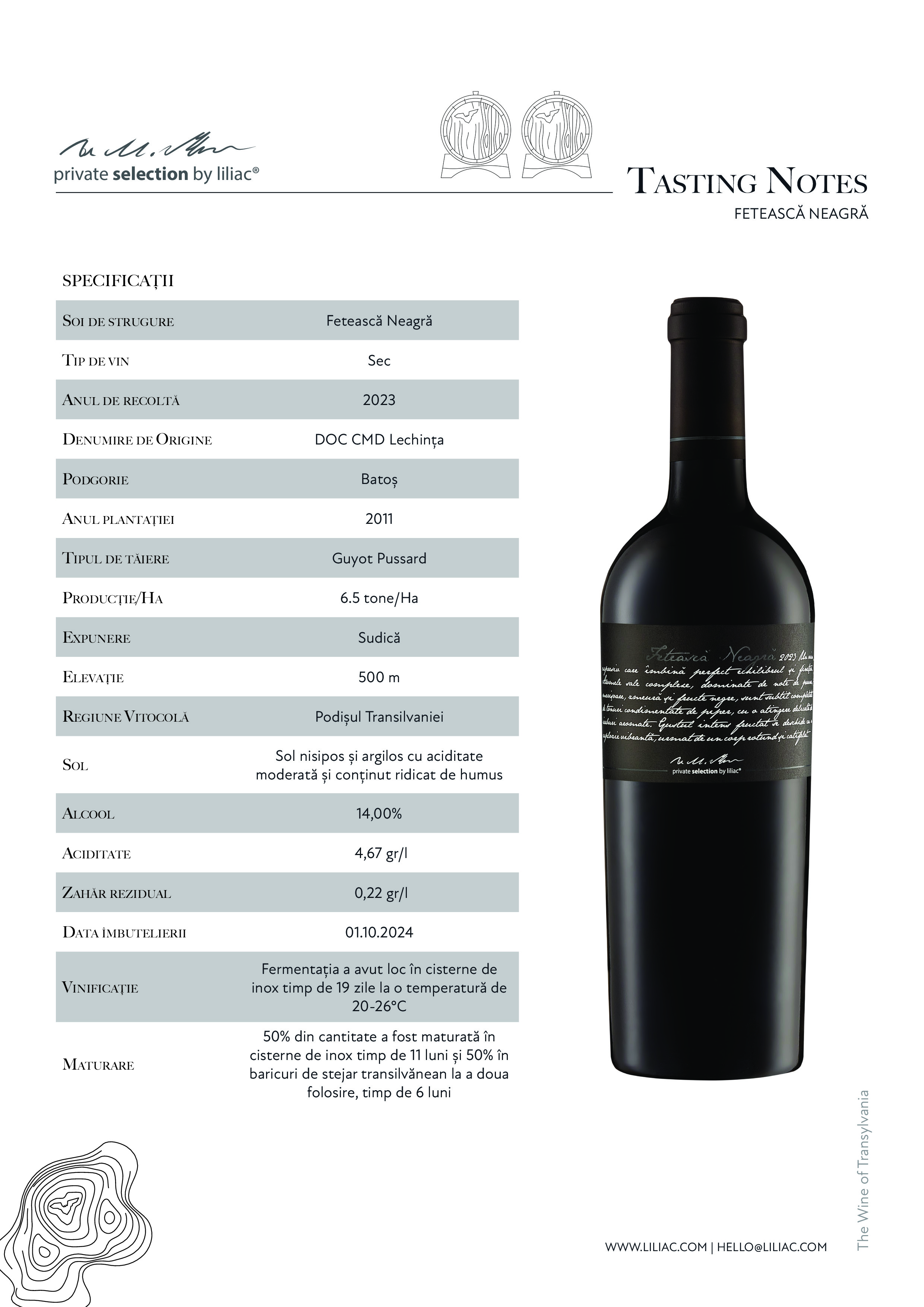 Maurare 50% din cantitate a fost maturată în cisterne de inox timp de 11 luni și 50% în baricuri de stejar transilvănean la a doua folosire, timp de 6 luni.