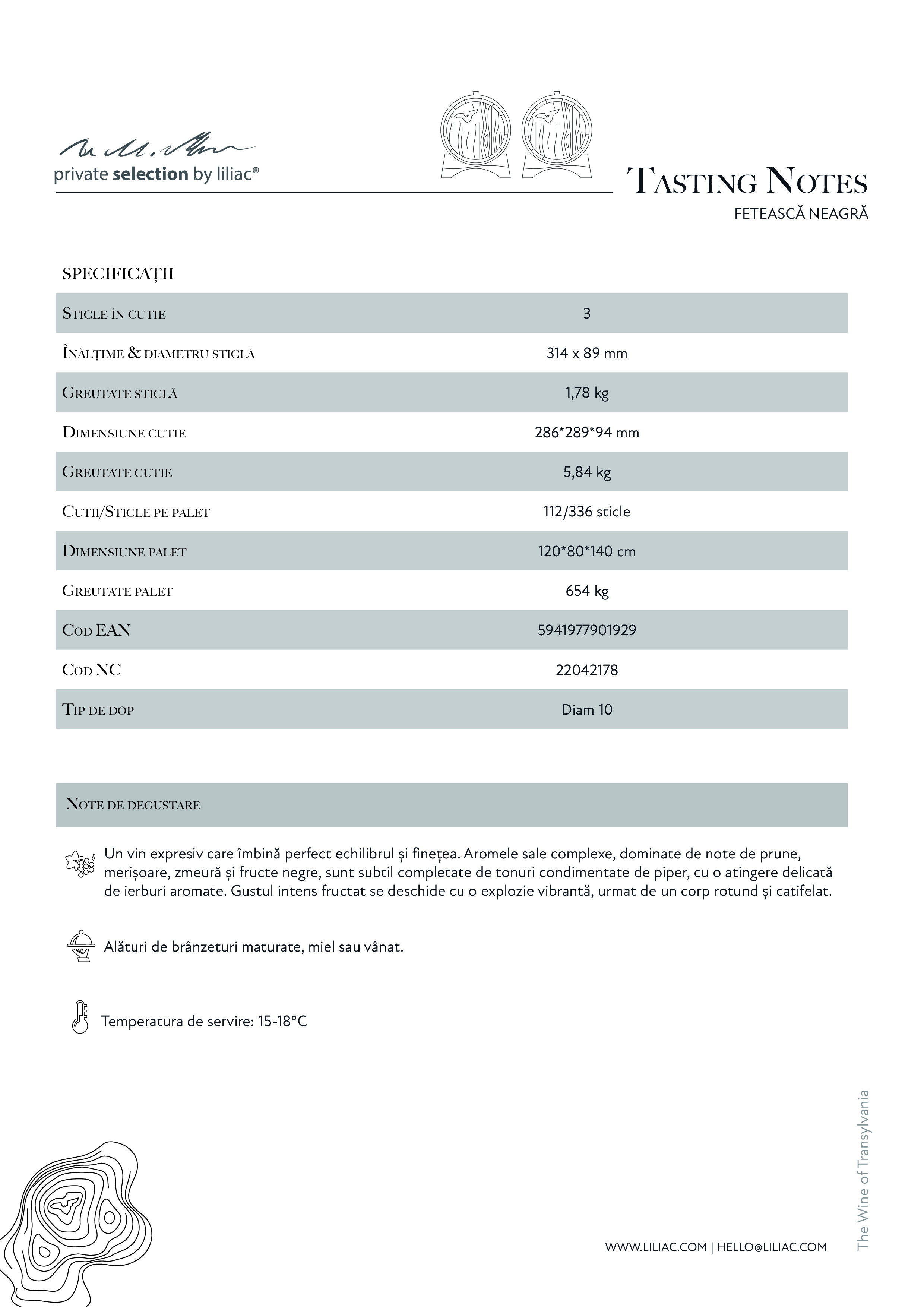 Un vin expresiv care îmbină perfect echilibrul și finețea. Aromele sale complexe, dominate de note de prune, merișoare, zmeură și fructe negre, sunt subtil completate de tonuri condimentate de piper, cu o atingere delicată de ierburi aromate. Gustul intens fructat se deschide cu o explozie vibrantă, urmat de un corp rotund și catifelat.
