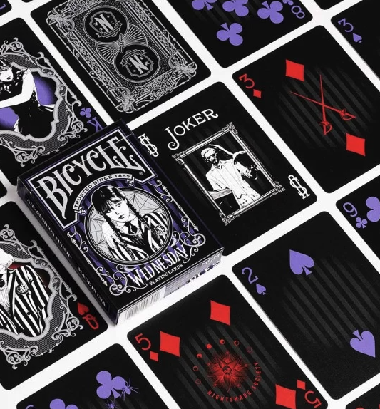 Paseste in lumea misterioasa a Nevermore Academy cu Bicycle Wednesday Playing Cards! Inspirate de celebrul serial Netflix cu Jenna Ortega in rolul Wednesday Addams, aceste carti de joc aduc un strop de eleganta gotica fiecarei partide. Fiecare carte, de un negru intens, este atent decorata si prezinta personaje indragite din serial, oferind un amestec perfect de stil si mister.