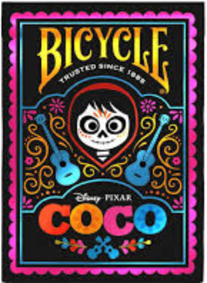 Oferă în dar amintiri de Ziua Morților cu cărțile de joc inspirate de Disney Coco de la Bicycle. Cutia holografică strălucește cu strălucirea multicoloră a unui alebrije puternic, în timp ce cărțile de joc (fețele) prezintă modele scheletice cu Miguel, Héctor, Ernesto de la Cruz și mulți alții.