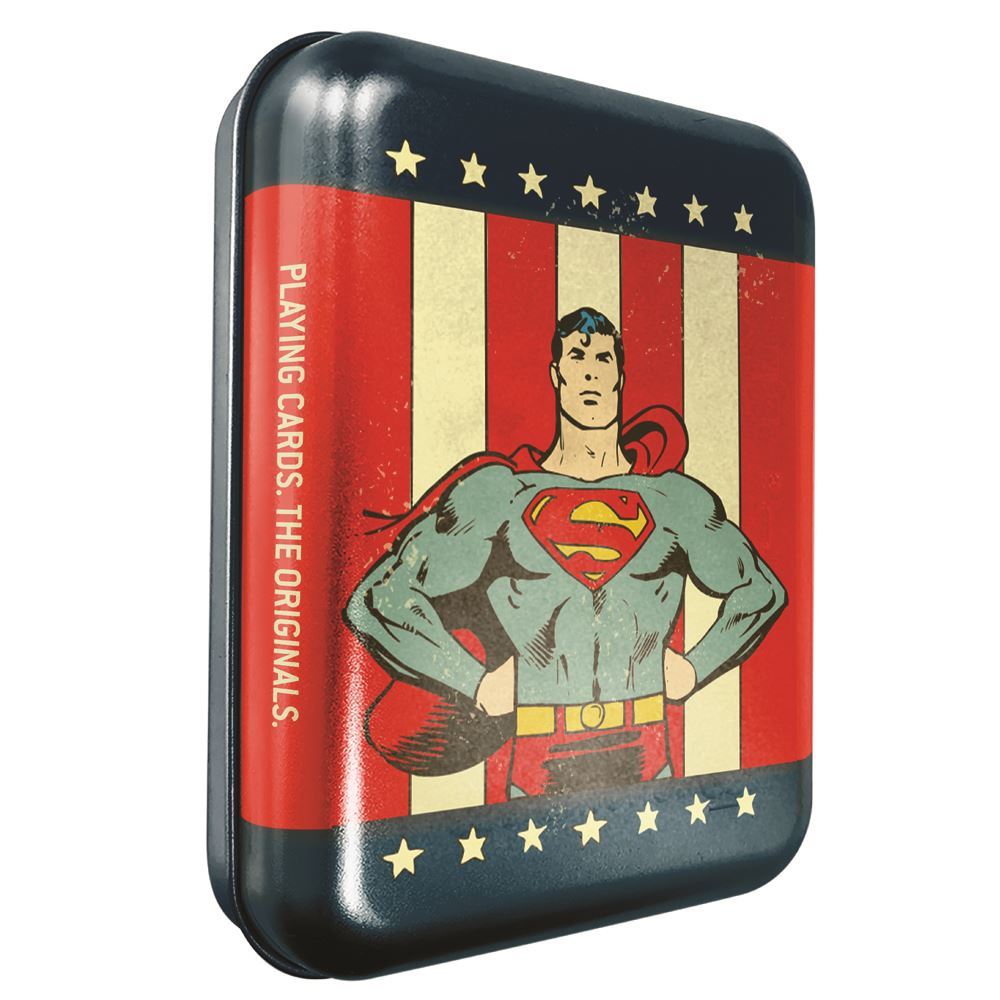 Carti de joc deosebite, in cutie metalica de colectie, cu celebrul super erou de film si desene animate, Superman.