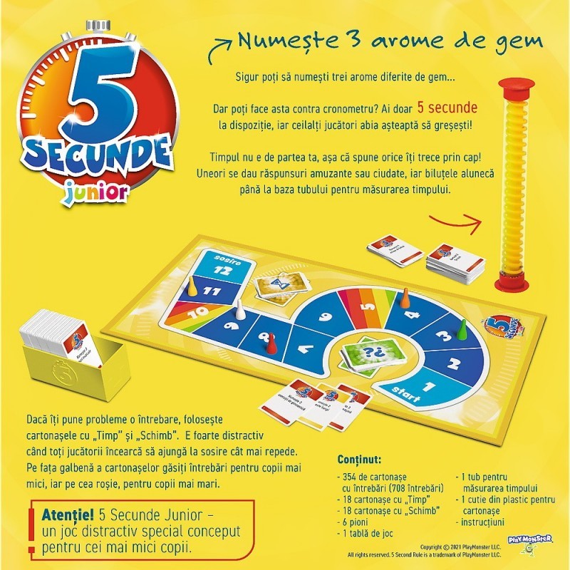 Puteti cu siguranta sa numiti trei arome diferite de gem, dar puteti face asta contra cronometru? Atentie! Aveti doar 5 secunde la dispozitie, iar ceilalti jucatori abia asteapta sa gresiti! Timpul nu e de partea voastra, asa ca spuneti orice va trece prin cap! Uneori dati raspunsuri ciudate sau amuzante cat aluneca bilutele pana la baza tubului pentru masurarea timpului. 5 secunde Junior este un joc pentru copii cu varste cuprinse intre 6 si 9 ani.
