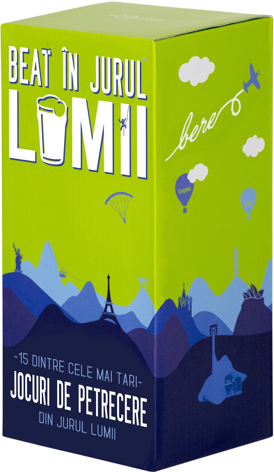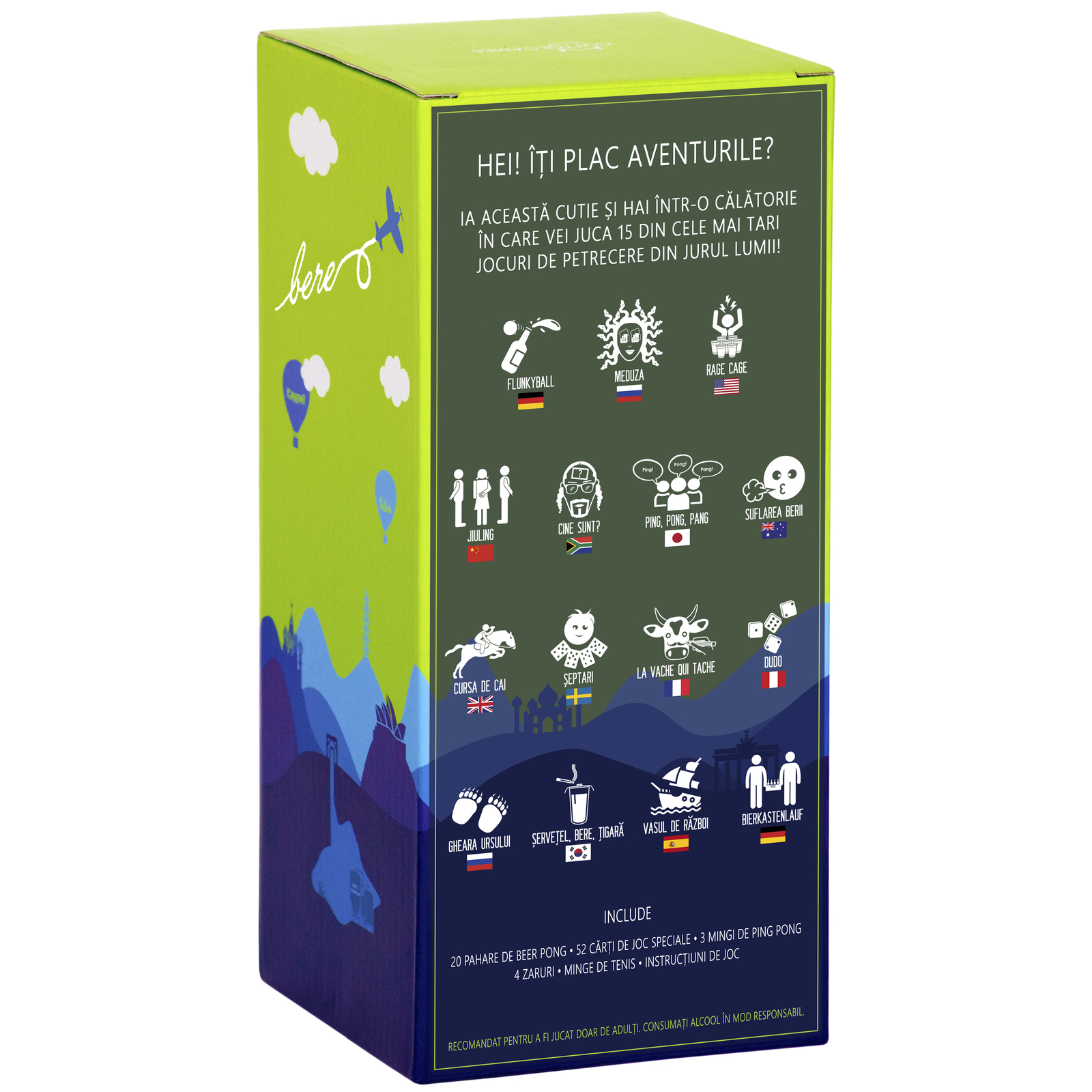 In cutia jocului Beat in Jurul Lumii veti gasi 20 pahare de Beer Pong, 52 carti de joc speciale, 3 mingi de ping pong, 4 zaruri, minge de tenis, instructiuni de joc in limba romana.
