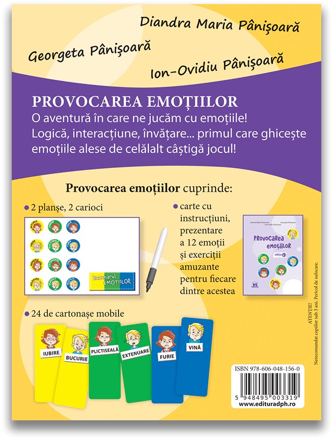 “Provocarea emotiilor” este o activitate in care ghicesti emotiile, te juci, le inveti. Contine si o carticica unde autorii au vorbit despre emotiile cuprinse in joc si au oferit multe alte exercitii amuzante pe care sa le faceti in familie.
