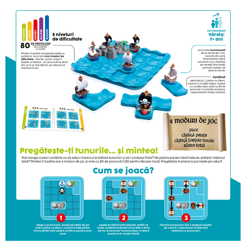 Pirates Crossfire este un joc pentru copii din seria Smart Games cu elemente de inalta calitate. Jocul include 80 de provocari logice cu dificultati crescatoare, recomandat pentru varstele 7+.