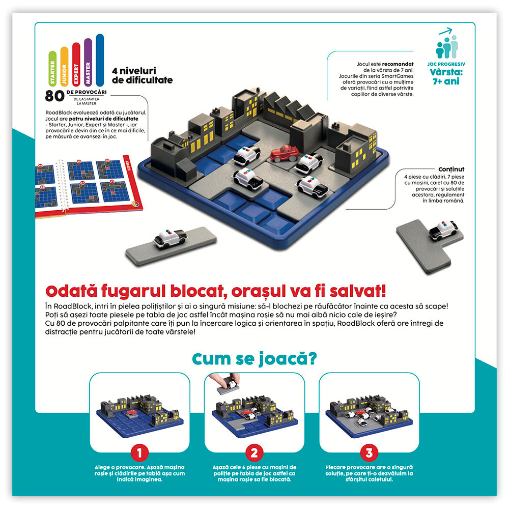 Contine: 1 tabla de joc, 4 piese cladiri, 6 masini de politie, o masina rosie si 1 brosura cu 80 de provocari si solutii, 1 regulament in limba romana.