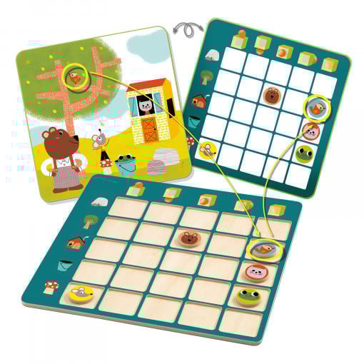 Un joc despre spațialitate în care jucătorii identifică pozițiile a 5 animale în raport cu 5 elemente spațiale prin plasarea token-urilor pe tablă.
