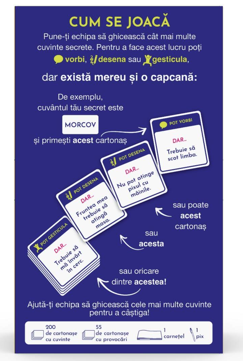 Scopul este sa iti ajuti echipa sa ghiceasca cat mai multe cuvinte secrete inainte sa expire timpul. Poti face asta vorbind, desenand sau gesticuland. Dar exista o provocare! Fiecare carte vine cu o rasturnare de situatie care iti va ingreuna misiunea – si o va face mult mai amuzanta.