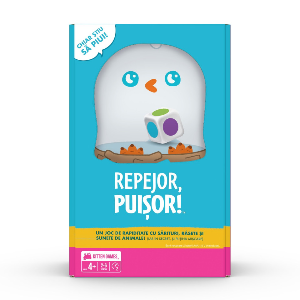 Noul joc de la producatorii Exploding Kittens, Repejor Puisor potrivit pentru copii dar si pentru adulti. Jocul se poate juca incepand cu varsta de 4 ani si are un mecanism foarte usor de inteles si dinamic. O runda dureaza aproximativ doua minute si se poate juca in 2 pana la 6 jucatori. Scopul jocului este sa treci peste provocarile amuzante cat mai repede si sa nu fi prins cu puisorul asupra ta cand se termina timpul. 2-6 jucatori. Varsta 4+