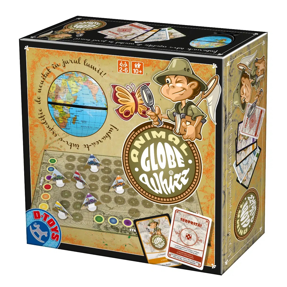 Cutia conține: 1 glob pământesc, 1 tablă de joc, 128 de cărți de joc cu peste 330 de întrebări despre animale, 1 hartă a lumii, 6 exploratori, 1 zar. Harta lumii Globe Whizz Animale este harta renumitului joc Animale din Continente, creat și ilustrat de I. Nicolau