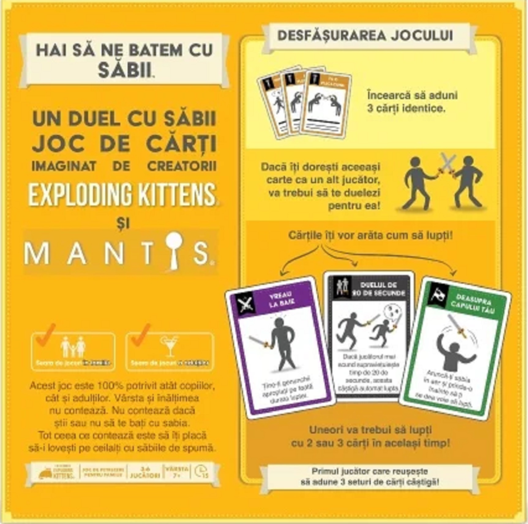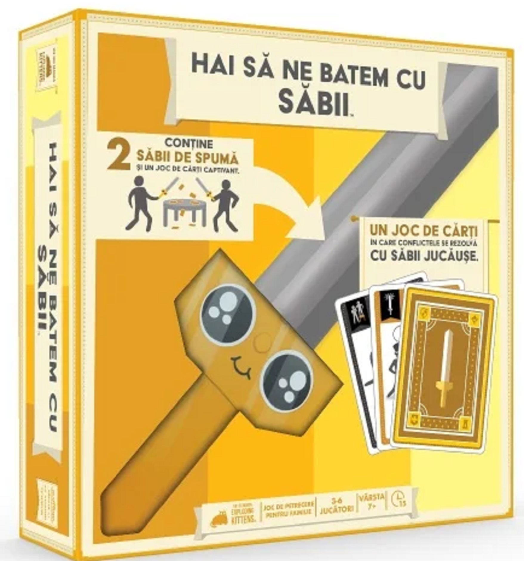 Hai sa ne batem cu sabii este primul joc de carti care include o lupta cu sabii, iar jucatorii isi castiga cartile duelandu-se intr-o multime de feluri distractive. Pachetul include 60 de carti de joc si 2 sabii din spuma. 2-6 jucatori. Varsta 10+