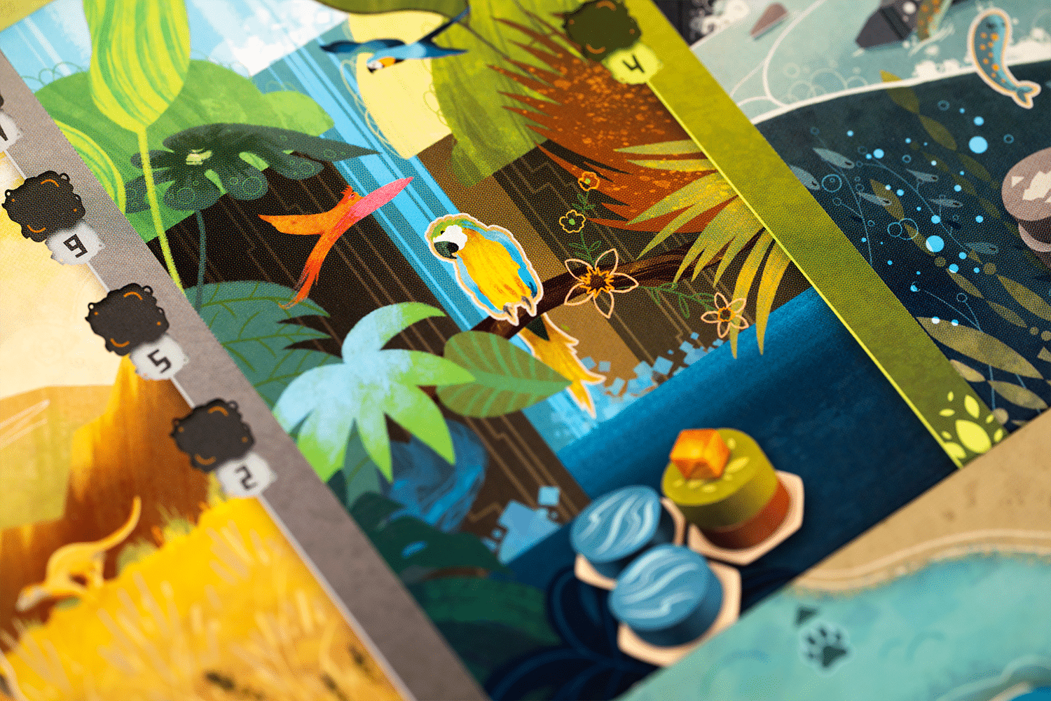 In Harmonies, you have to create your landscapes by placing colored tiles and thus build habitats for your animals. If you want to get the highest number of points and win the game, you will have to include habitats in your landscapes strategically and host as many animals as you can.
