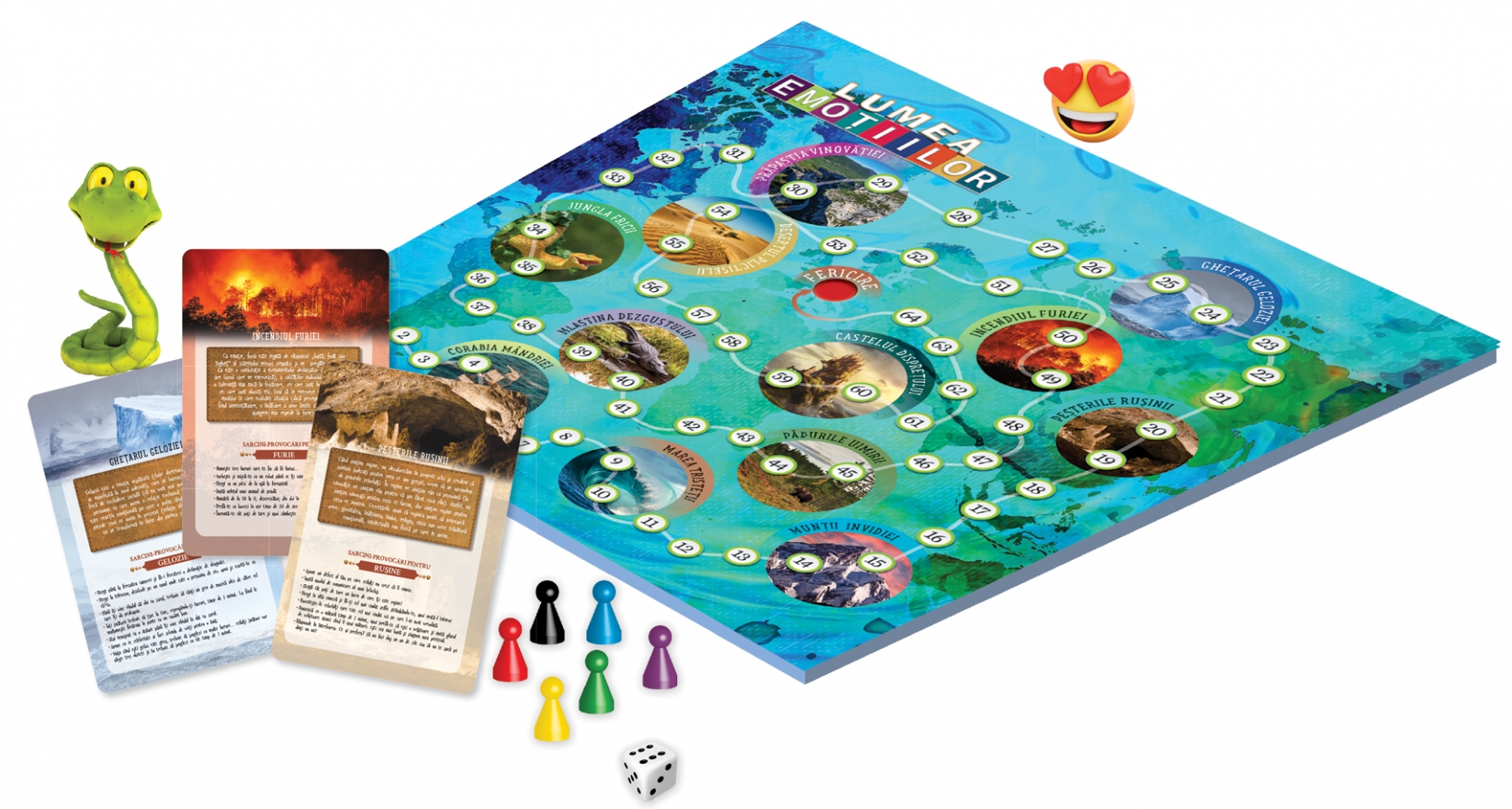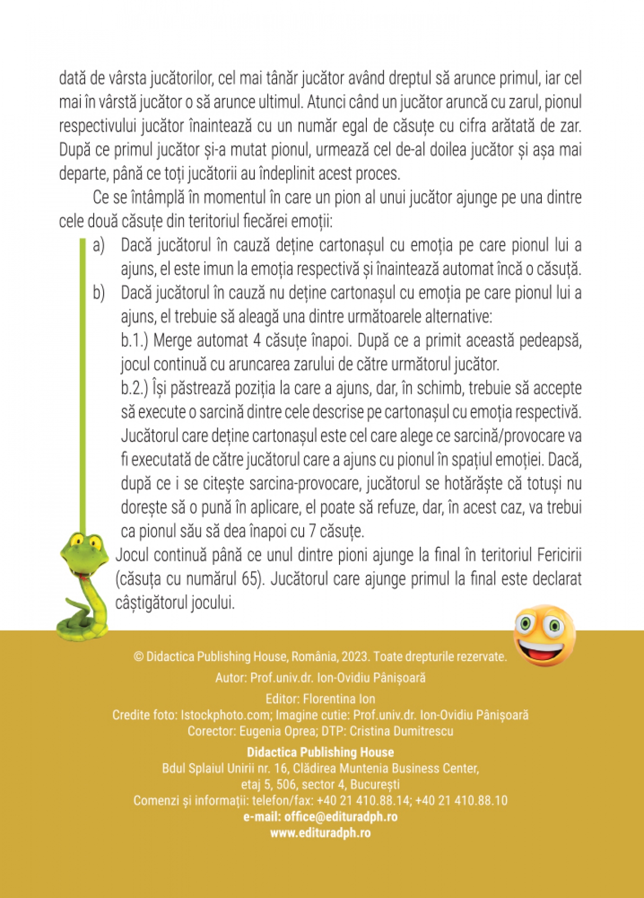 Cele 12 cartonase-emotii contin, fiecare, o descriere a emotiei respective si cate 7 sarcini-provocri pentru fiecare emotie. Dac ai noroc poti deveni proprietarul emotiei ceea ce iti ofer imunitate si posibilitatea de a da sarcini-provocri celorlalti juctori pe care ii prinzi in emotia ta. Crezi c poti depsi toate cele 12 emotii si s ajungi primul la Fericire? Jocul contine o tabl de joc, un zar, sase pioni si 12 cartonase-emotii. Aceste cartonase-emotii contin, fiecare, o descriere a emotiei respective si cate 7 sarcini-provocri, gandite s fie in acord cu aceasta. Caracteristici Mrimi 3937 cutie Autori Ion-Ovidiu Panisoar Grupa de varst 5 ani