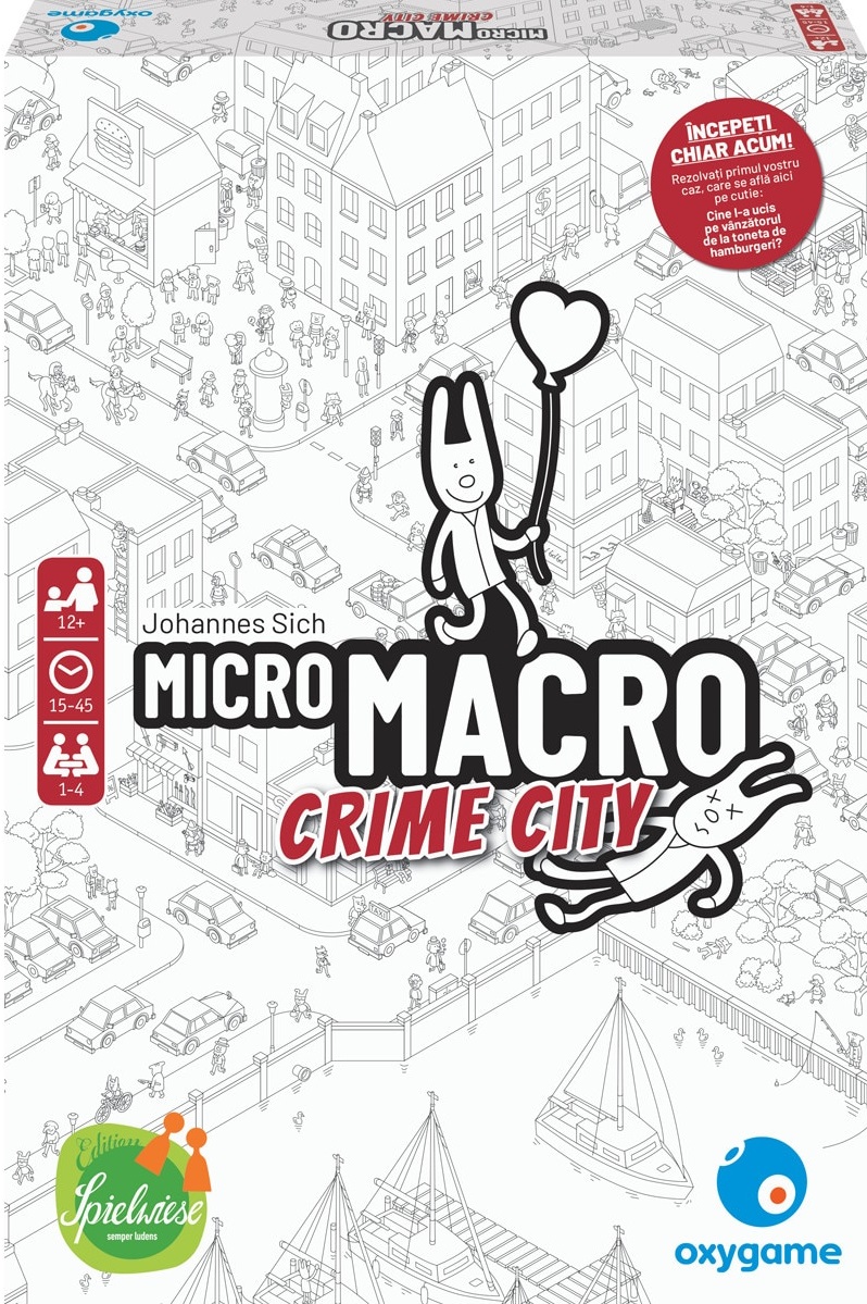 Bine ai venit in Crime City, un oras in care criminaliitatea se ascunde dupa fiecare colt. Secretele fataleletaleidice, talhariile false si crimele cu sange rece sunt la ordinea zilei. Politia locala nu mai poate controla ceea ce se intampla. Prin urmare, este necesara munca unor investigatori abili. MicroMacro - Crime City este un joc cooperativ de cooperare de intre detectivi. Impreuna, jucatorii rezolva 16 cazuri penale dificile, determinand motive, gasind probe si condamnand faptasii. Un ochi atent este la fel de important ca un talent creativ pentru combinatie, pentru a dezlega totul toate misterele de pe harta orasului de 75 x 110 cm. In joc este inclusa si o lupa ca un mic ajutor.