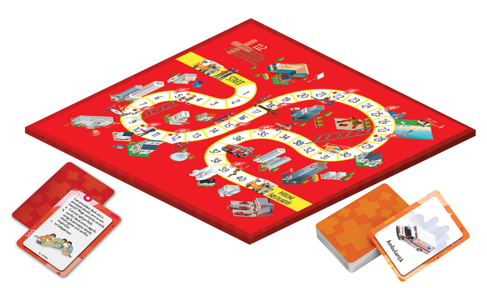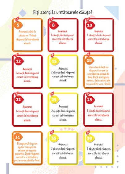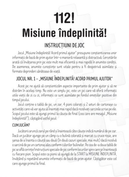 Jocul conține: o tablă de joc, un zar și patru pioni colorați, trei seturi de cartonașe (135 de bucăți) cu activități care te vor ajuta să înaintezi mai rapid dacă rezolvi sarcinile scrise pe ele și două afișe cu tehnici de prim ajutor.