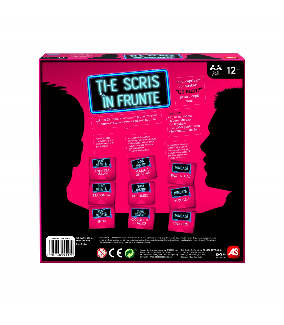 Ti-e scris in frunte un joc istet si distractiv, in care jucatorii au pe frunte un cartonas ilustrat si trebuie sa ghiceasca cuvantul cu ajutorul intrebarilor adresate adversarilor. Adversarii trebuie sa raspunda cu da sau nu la intrebarile adresate, iar jucatorul trebuie sa ghiceasca cuvantul in intervalul de timp stabilit prin intoarcerea clepsidrei. Castiga jucatorul care ghiceste cele mai multe cartonase! Ti-e scris in frunte - Cel mai amuzant si cel mai rapid joc cu intrabari acum si pentru copii mari, cu 3 moduri de joc: ghici cuvantul, sunetul si mai si mimezi cuvinte! Totul pentru si mai multa distractie pentru petreceri! Pentru un joc si mai antrenant, acesta se poate desfasura si pe echipe! Jocul contine: cartonase, benzi de cap, jetoane, 1 clepsidra, 1 regulamentul de joc.