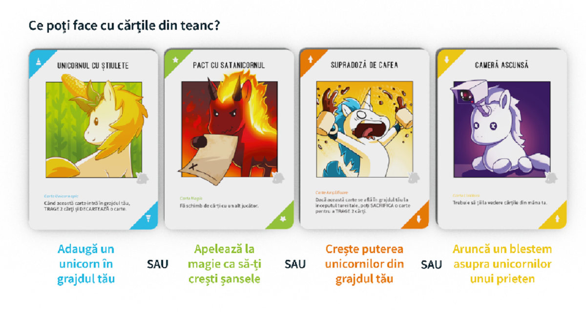 Faceti acest lucru adunandu-va propria armata de Unicorni si folosind o combinatie a puterilor lor magice si a cartilor Magice, Instant, Upgrade si Downgrade pentru a impiedica progresul celorlalti jucatori si pentru a le distruge Unicornii.