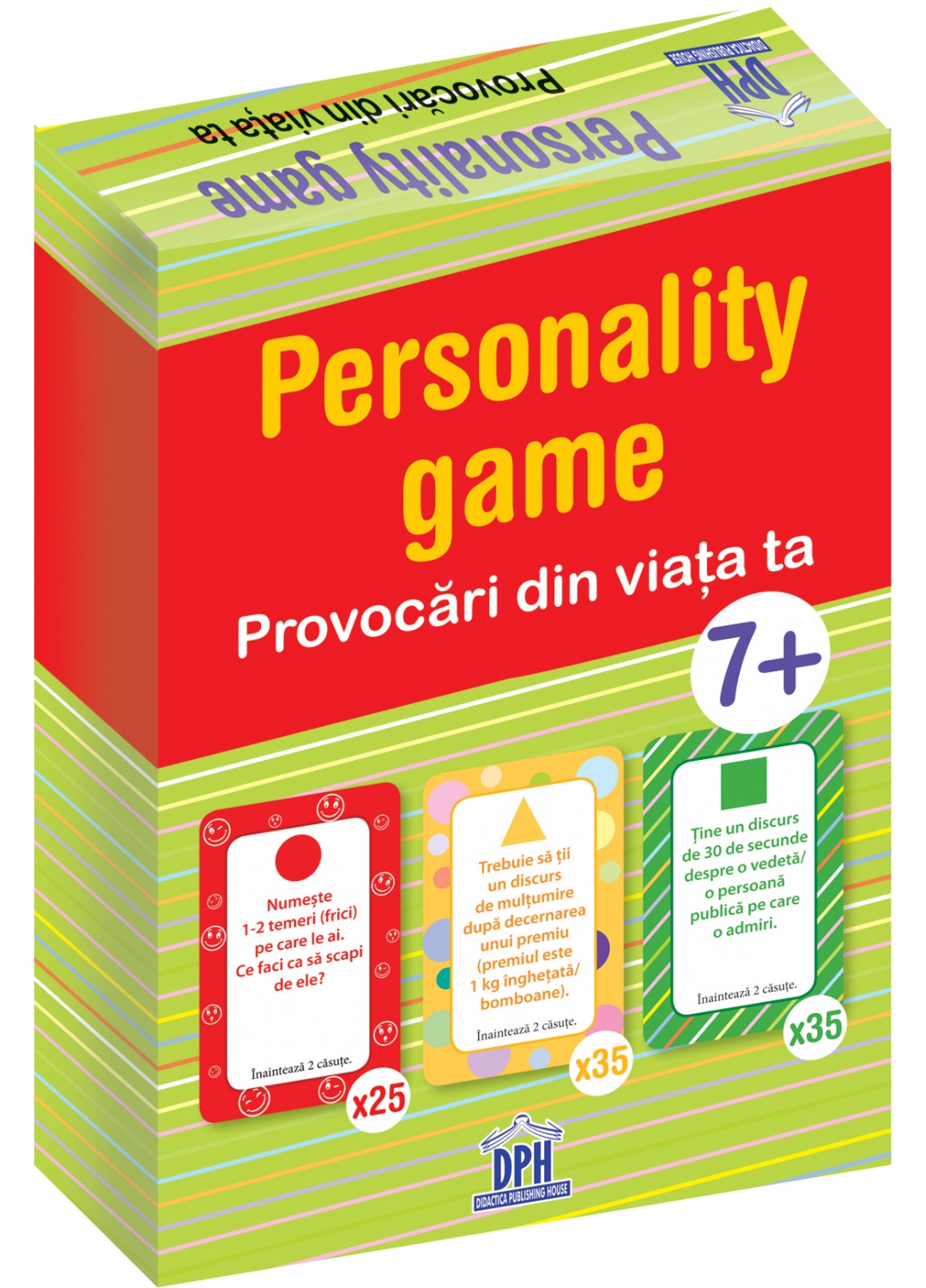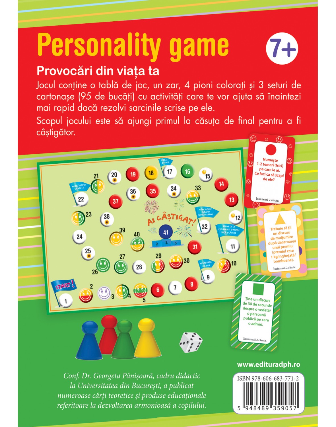 Jocul contine o tabla de joc, un zar, 4 pioni colorati si 3 seturi de cartonase (95 de bucati) cu activitati care te vor ajuta sa inaintezi mai rapid daca rezolvi sarcinile scrise pe ele.