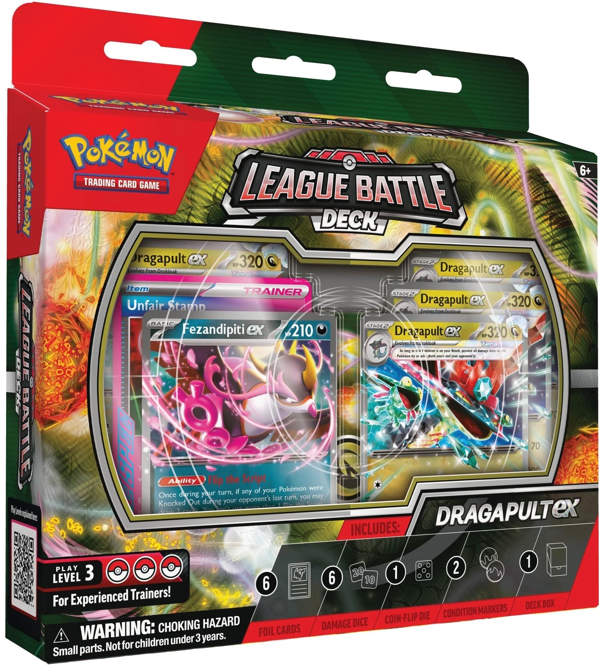 Pregătește-te pentru confruntări intense cu League Battle Deck: Dragapult ex, un pachet de 60 de cărți gata de joc, conceput pentru jucători care vor să intre rapid în acțiune și să exploreze strategii eficiente. Acest deck oferă o abordare solidă și clară, punând accent pe consistență și presiune constantă, datorită abilităților ofensive ale lui Dragapult ex.