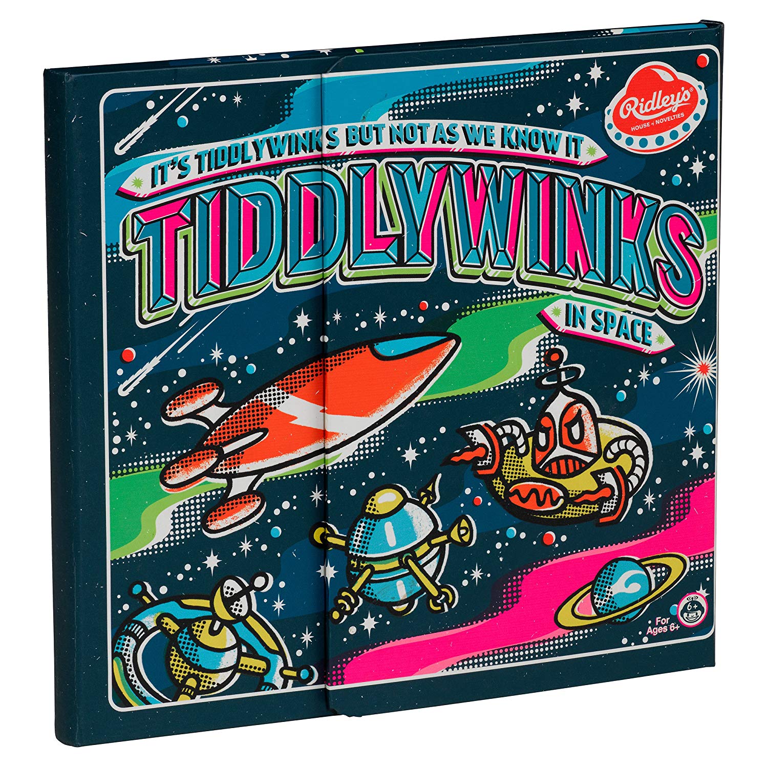 Old-fashioned fun goes space age with ridley’s Atomic tiddlywinks. This is tiddlywinks, but not as we know it! packed in a cool retro designed box with magnetic closure that folds out to form the game board with full instructions and all the pieces you need to score high.