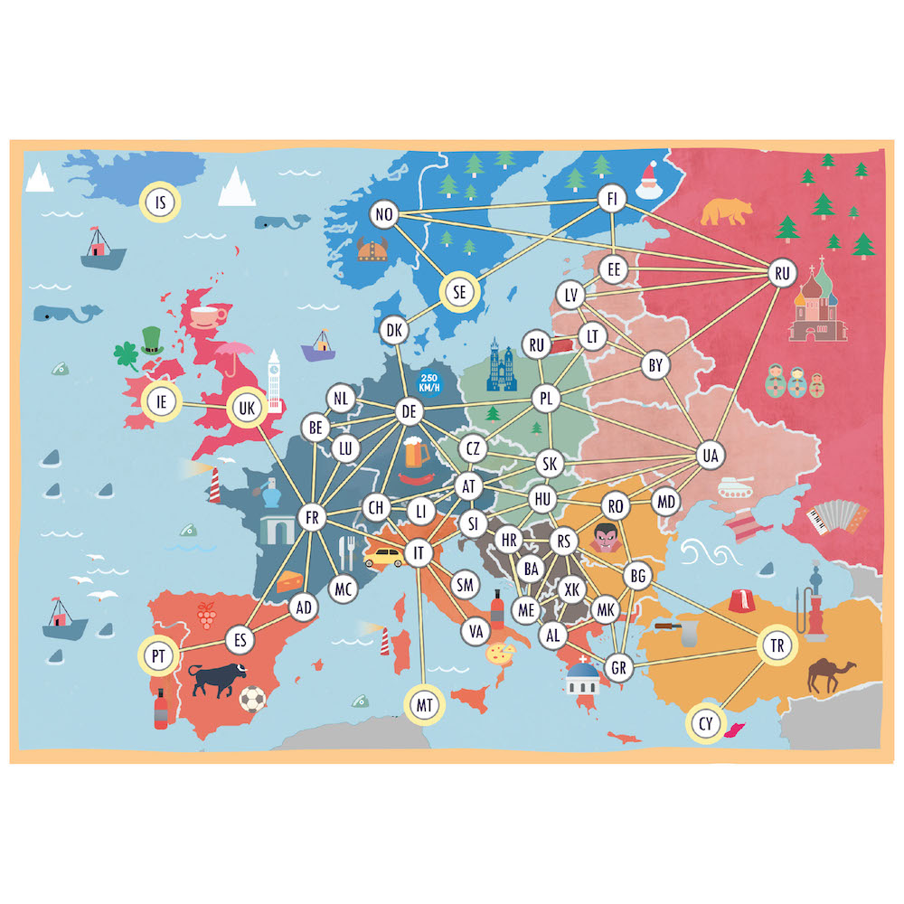 Venetia, Eiffel-ul, buncarele albaneze, taximetristii dubiosi, kebabul stricat,hotelurile inghesuite....toate astea le vei gasi in acest joc plin de umor. Un joc de petrecere cu 120 de carti impreuna cu harta Europei care iti va asigura un trip fascinant prin batranul continent.