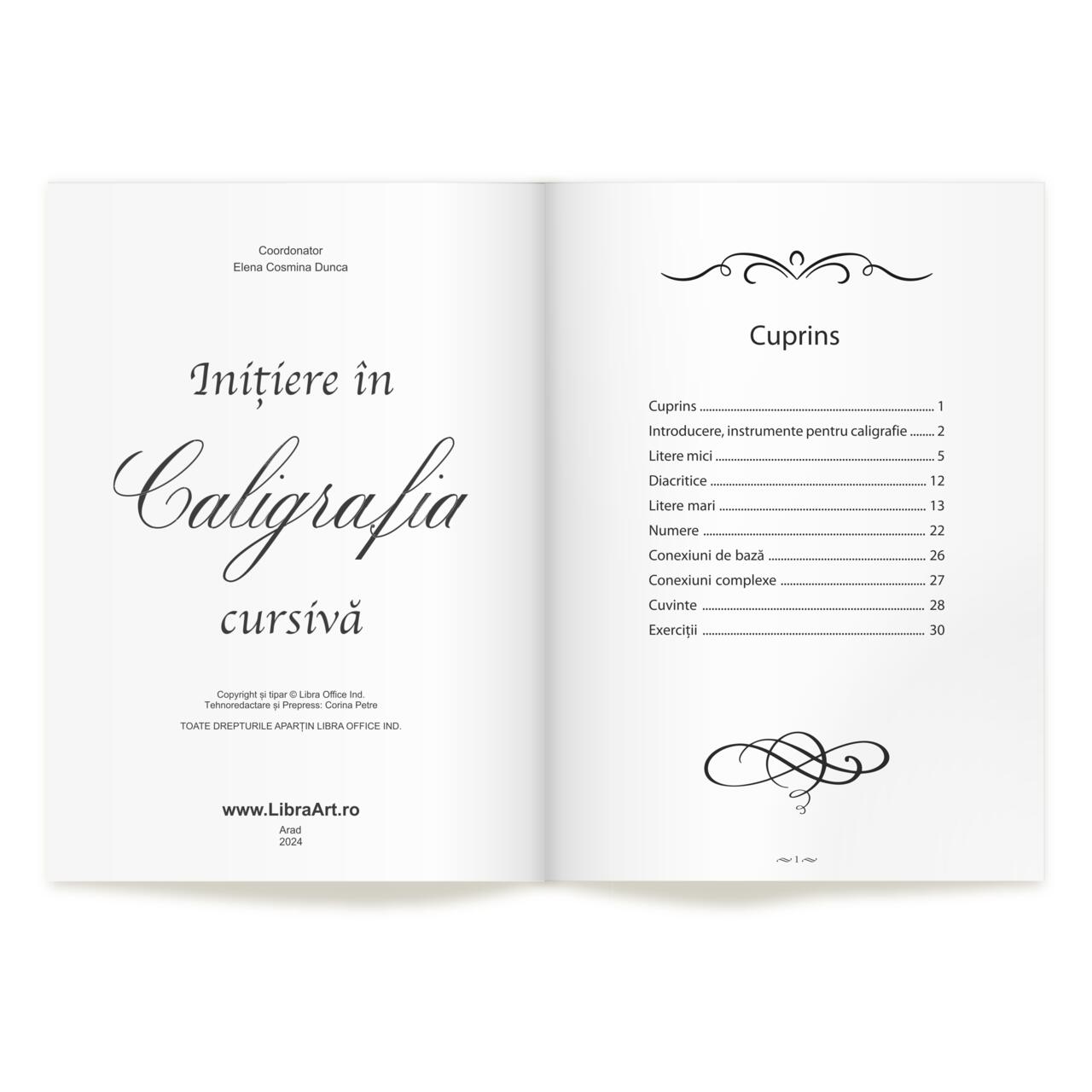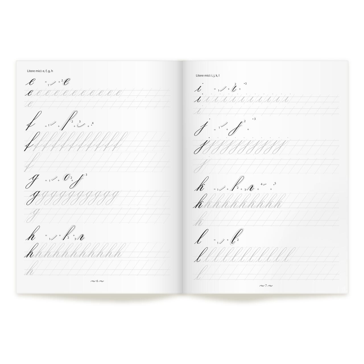 Initiere in caligrafie cursiva, caiet A4, contine 32 pagini, hartie speciala de 120g, coperta carton lucios de 250g