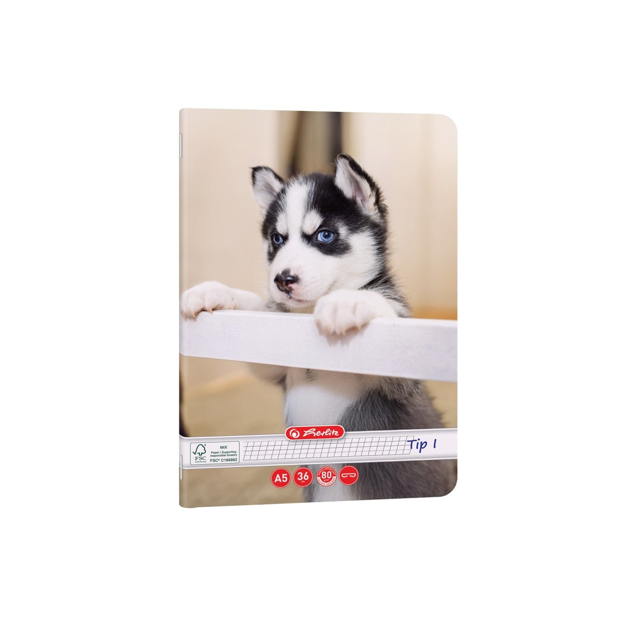 Caiet tip I, format A5, coperti policromie, carton duplex, hartie 80 g/mp, 36 file, colturi rotunjite, liniatura speciala, capsat, motiv Cats & Dogs.