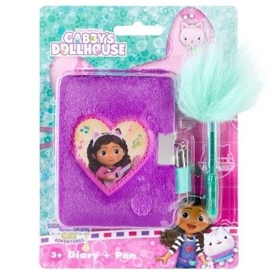 Jurnalul de pluș cu tematică Gabby's Dollhouse conține un lacăt și un pix.