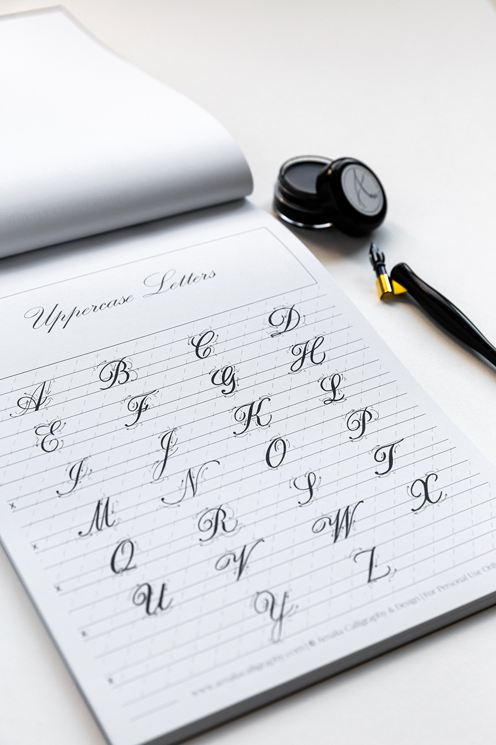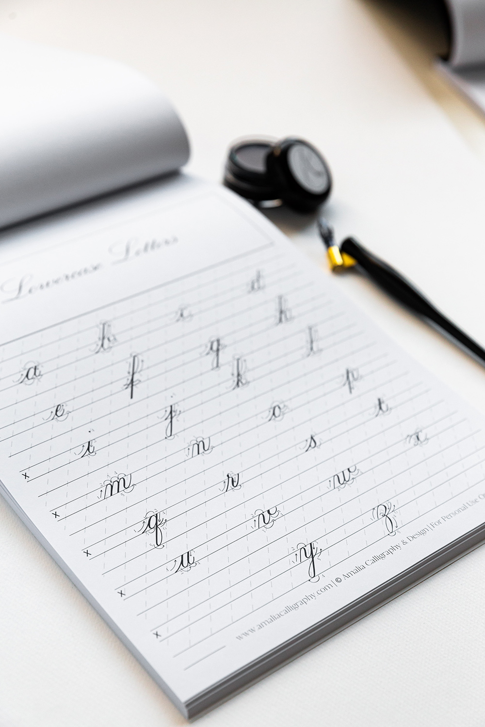 Caietele includ instructiuni in limba Engleza pentru setarea instrumentelor si spatiului de lucru, formele de baza pentru constructia de litere, grile speciale de lucru pentru o buna armonizare a proportiilor, instructiuni pentru optima constructie de litere si forme trasabile ce pot fi urmate in scriere pentru dezvoltarea memoriei musculare pe formele corecte. Lucrul in caiete incepe, atat pt literele mici, cat si pt literele mari cu forme de baza, pentru ca mai apoi, folosindu-le pe acestea sa se construiasca literele. Fiecarei forme, respectiv litere ii este dedicata o foaie de lucru cu instructiuni si shema de constructive cu sageti. De asemenea, fiecare pagina are forme si litere trasabile, pe urma carora se lucreaza in vederea formarii memoriei musculare pentru forma ideala. Caietele de caligrafoe pot fi folosite de adulti si copii, hartia suporta o gama variata de cerneluri si in ele puteti scrie cu stilou, brush pen scurt sau toc, penita si cerneala. Da-ti sansa sa iti dezvolti un nou hobby si sa desoperi cate lucruri creative poti face folosind caligrafia si relaxandu-te in acelasi timp. Lucrul in caiete va poate folosi pentru infrumusetarea scrierii de mana, facandu-va mai atenti si consctienti la procesul scrieriii si la formele si proportiile literelor. Setul poate fi un minunat cadou pentru cineva drag. Setul nu include alte materiale de lucru.
