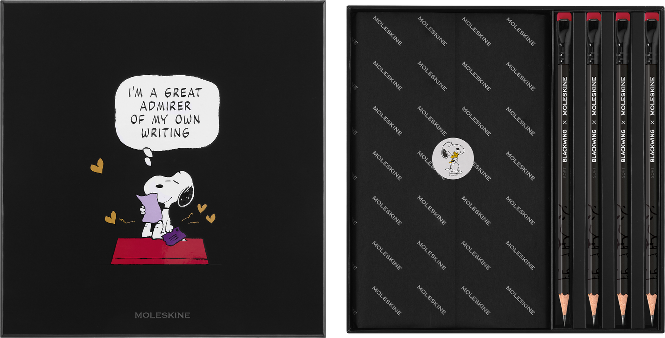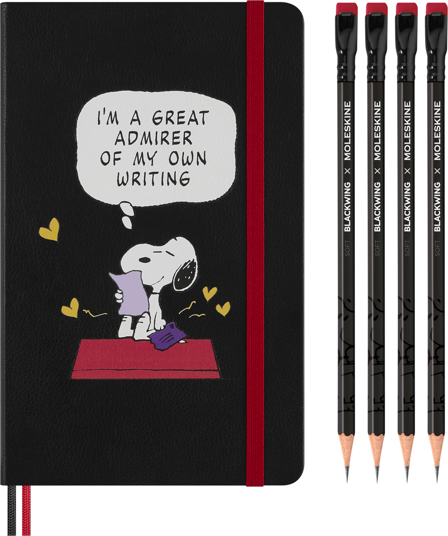 Capture your thoughts, ideas, and doodles with this Peanuts x Moleskine Notebook and Pencil Set—a celebration of simple truths and the power of handwriting. The gift box includes a large, ruled notebook featuring iconic Peanuts graphics that highlight the joy of writing, along with four limited-edition Peanuts pencils by Blackwing.