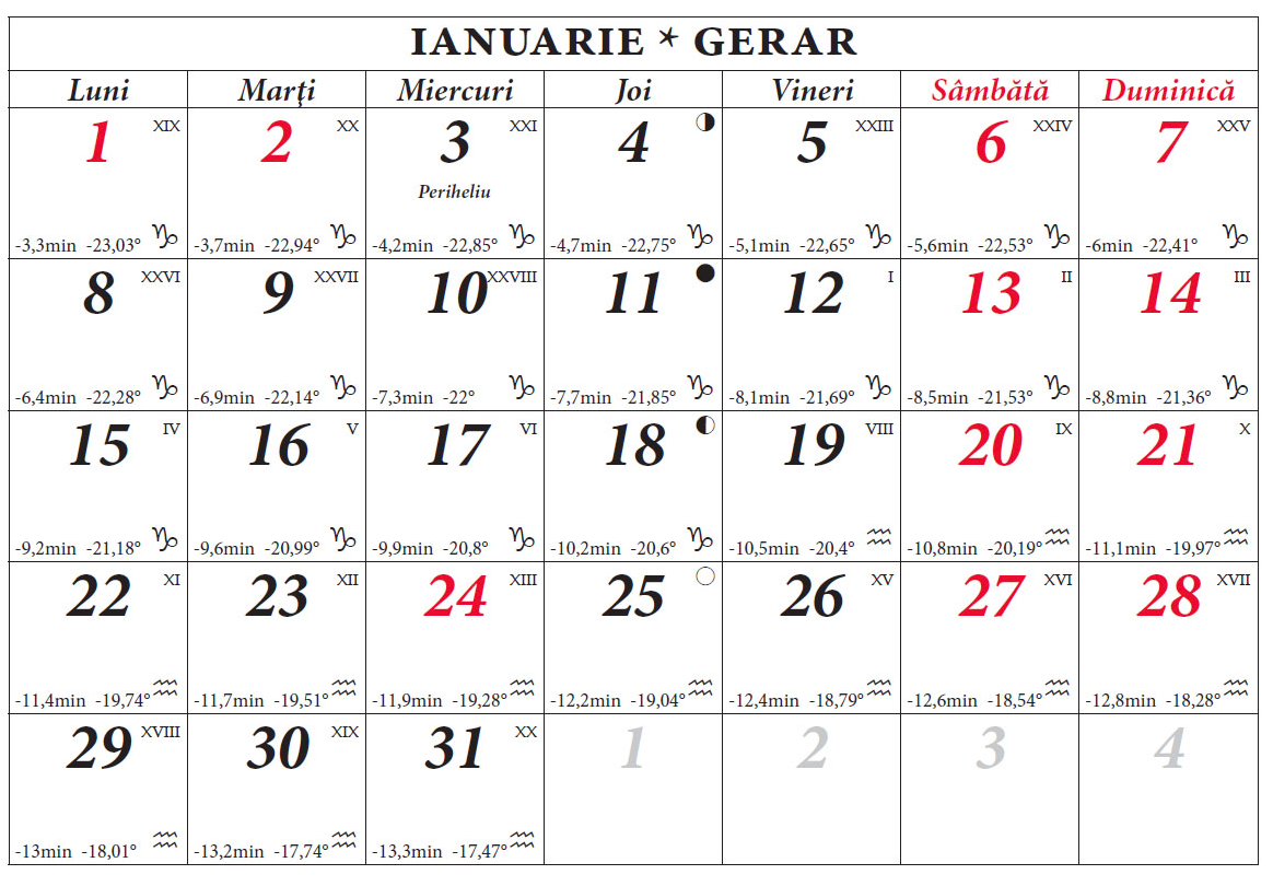• Calendarul dezvăluie modul în care se poate citi ora de pe un ceas solar chiar și în timpul nopții, pe baza Lunii, fazele lunare fiind în esență un produs al luminii solare împrumutate de satelitul nostru natural;