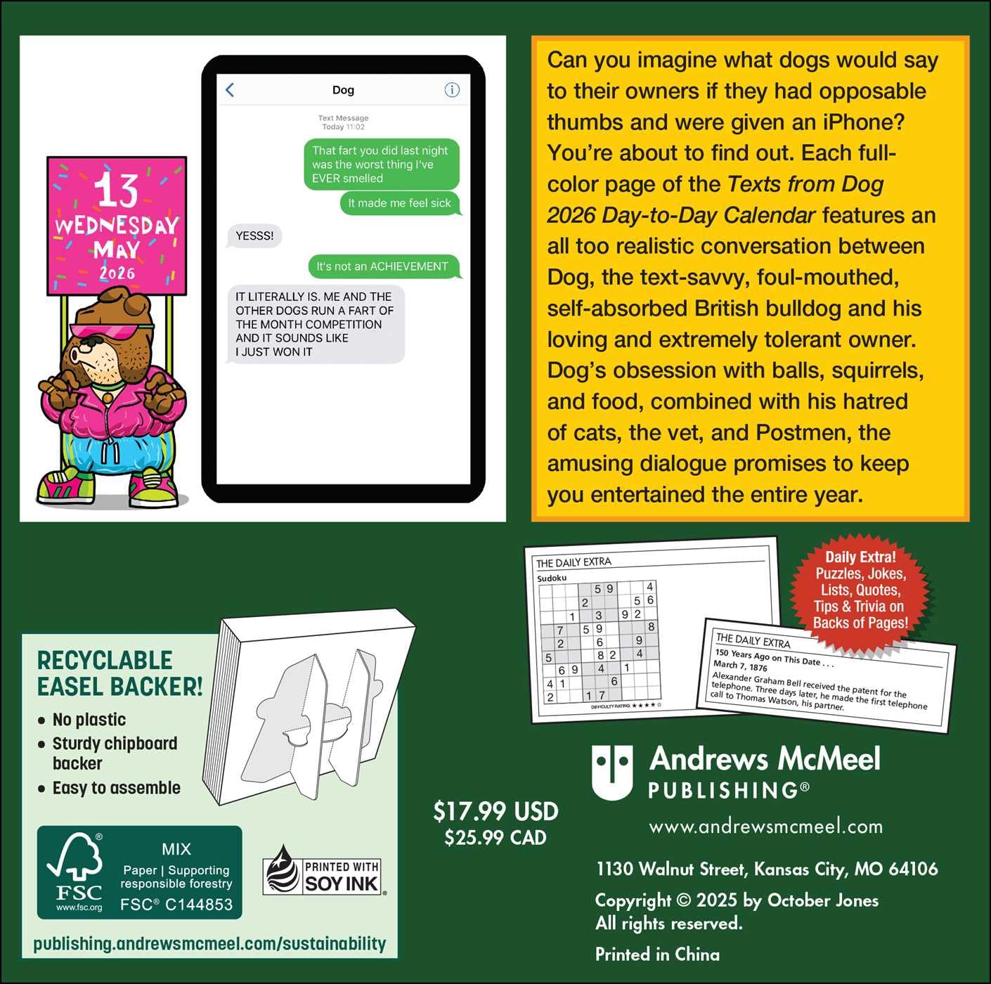 Each page of the Texts from Dog 2026 Day-to-Day Calendar features an all too realistic conversation between the text-savvy, foul-mouthed, lazy, and somewhat crude bulldog and his loving and extremely tolerant owner. With Dog's obsession with balls and food, and hatred of cats and Postmen, the conversations never get old.