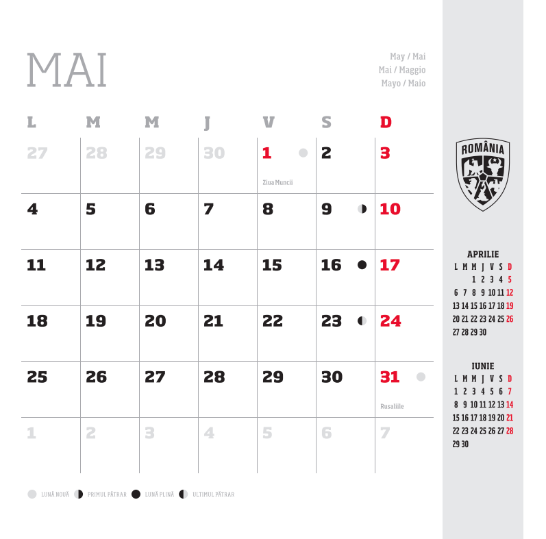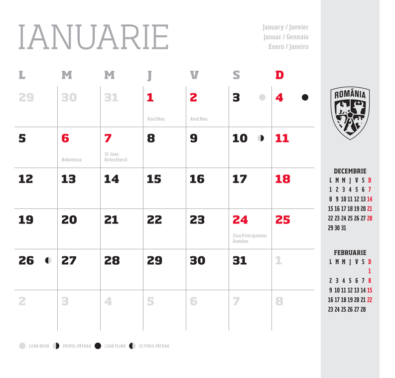 Calendar de perete cu 14 file (inclusiv coperta), realizat din hârtie lucioasă de 200 gr/mp.Dimensiuni: 30 x 30 cm.