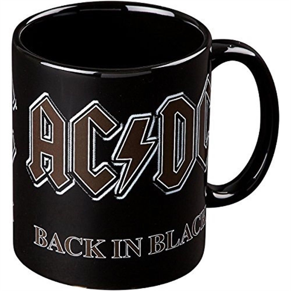 Cană având un design inspirat de cel al albumului Back in Black al trupei AC/DC.