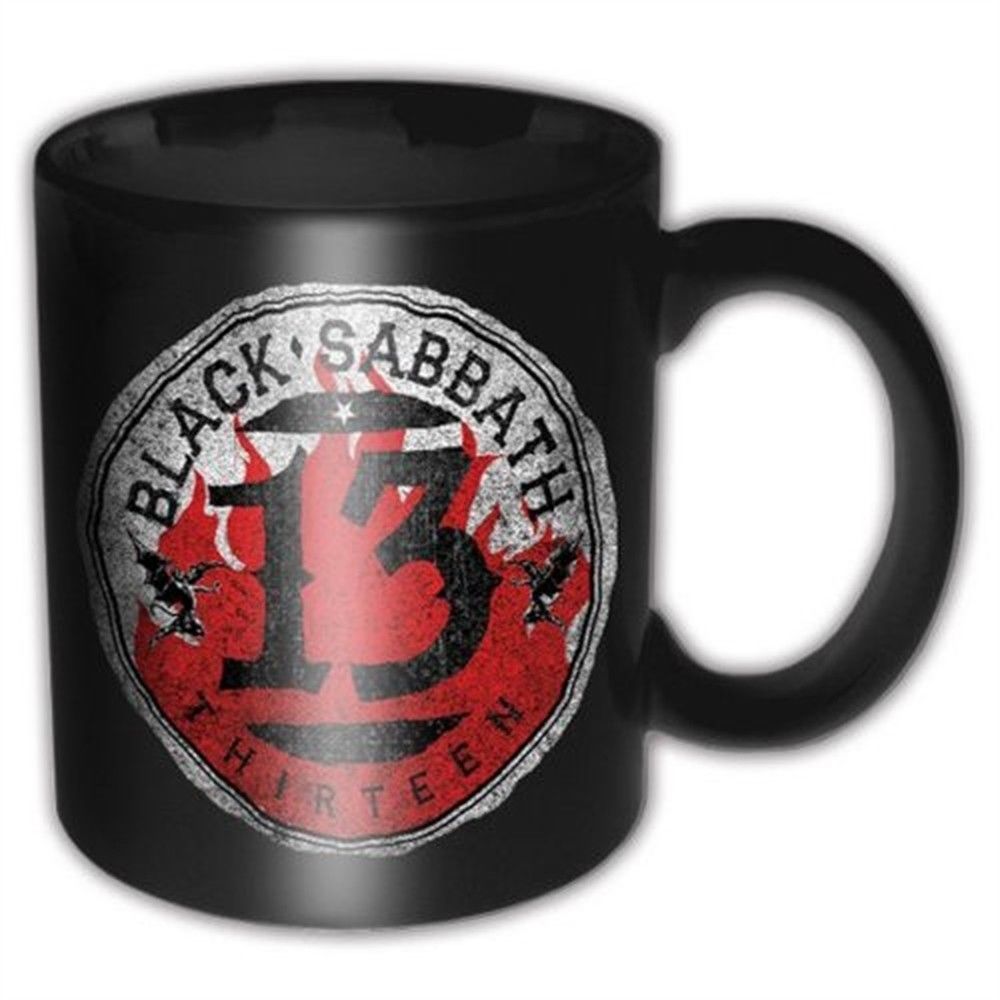 Cană având un design inspirat de cel al albumului „13” al trupei rock Black Sabbath.