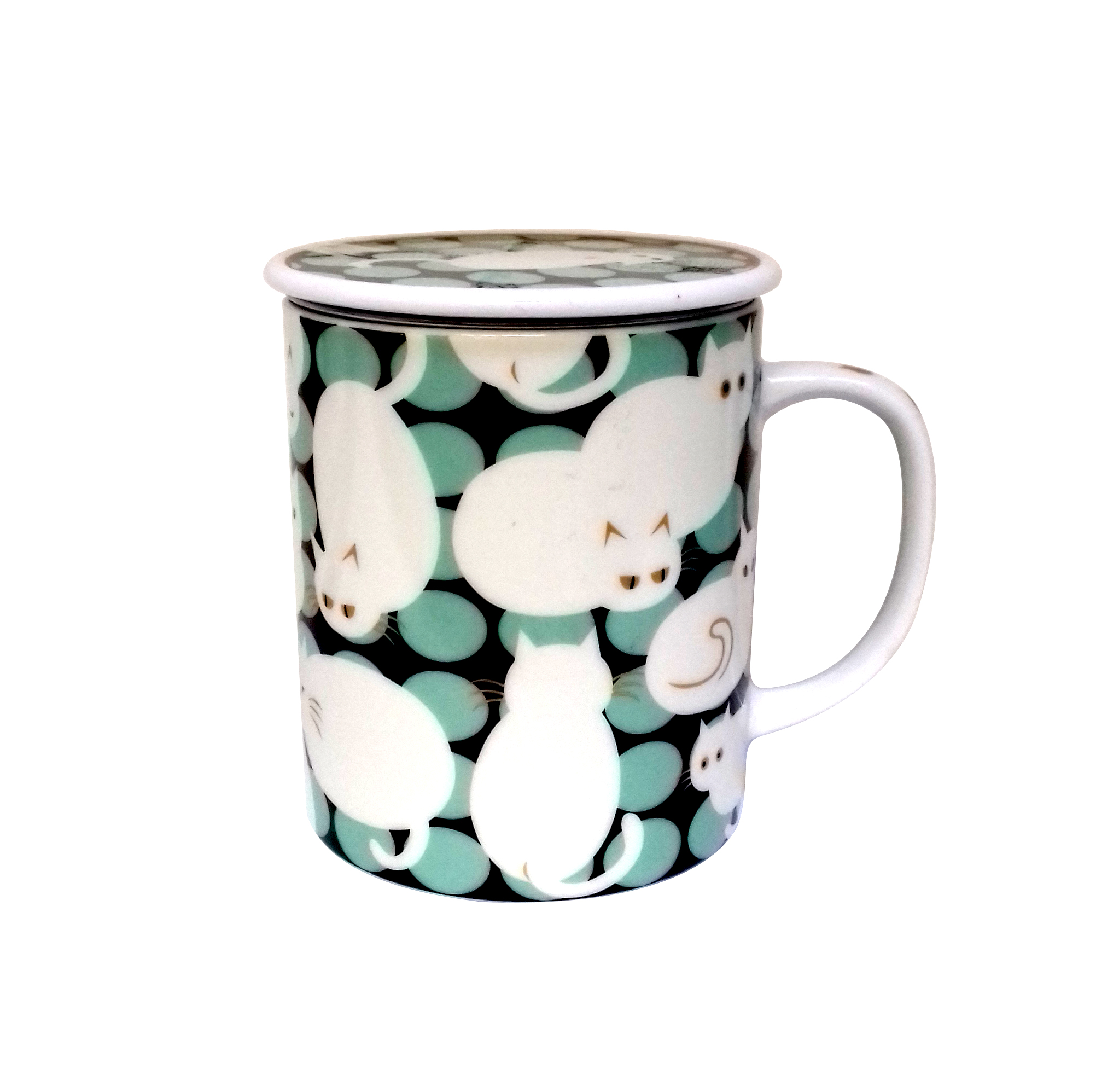 Cană elegantă din porțelan cu infuzor, cu un design unic si intens colorata, decorată cu imagini inspirate din arta tradițională japoneză.